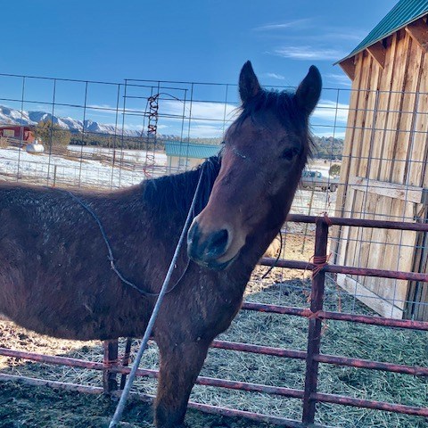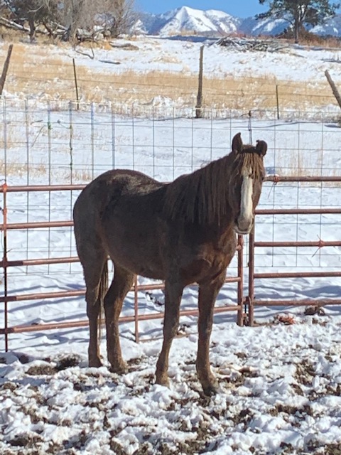 Dasher is from the Fish Creek HMA and just turned 3 years old. He was gathered in late September and arrived to Mancos Mustangs in early December! Dasher earned his named from being spunky. He loves to Dash away in new situations then calms down and learns quickly!
